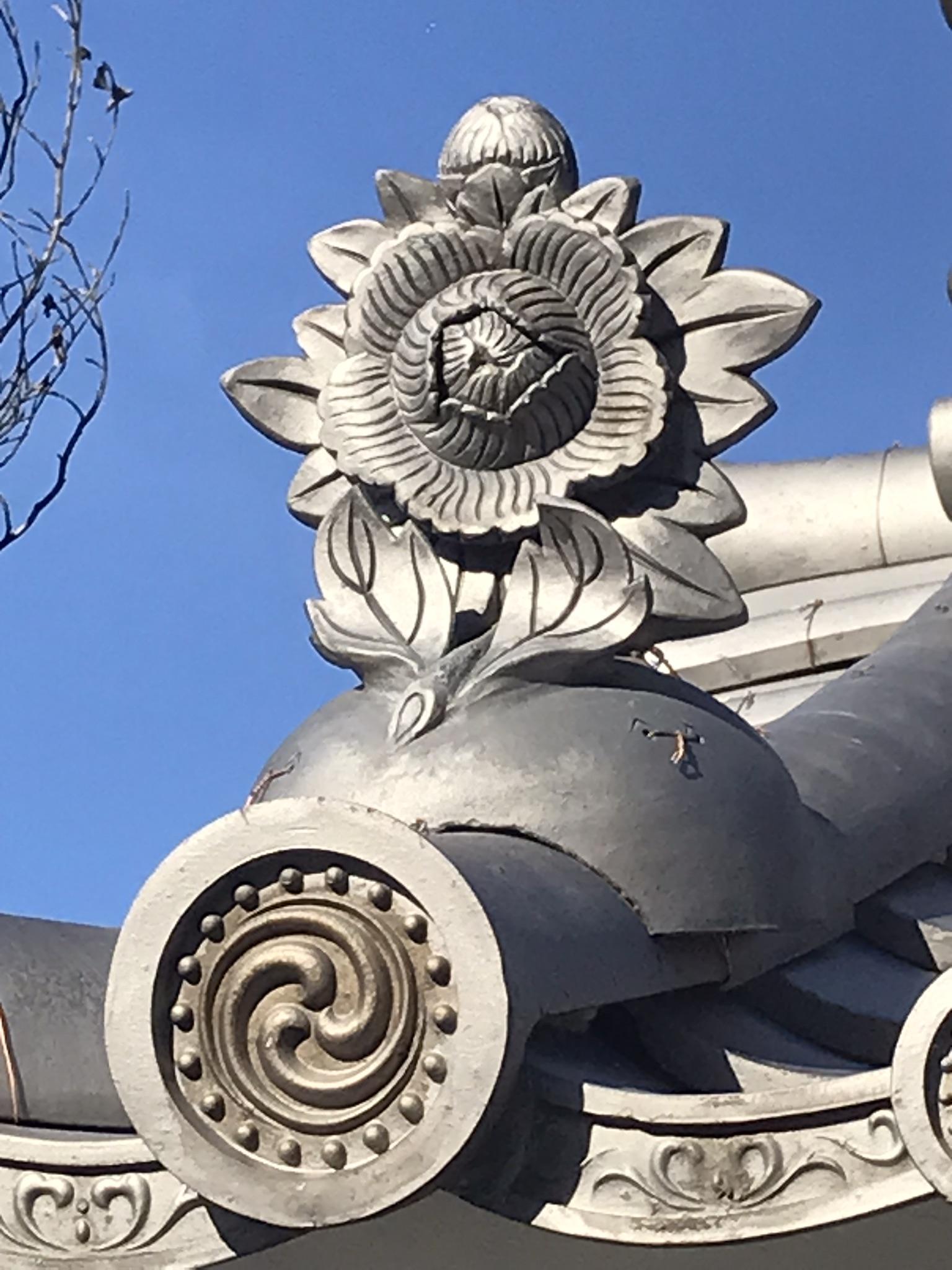 調べると、牡丹は“百花の王”といわれ、その飾り瓦には幸福や富貴の願いが込められているとか。まわりを飾る瓦も、繊細な模様が施されています。優美な雰囲気は、着物や茶道体験ができる極楽寺にぴったりです。