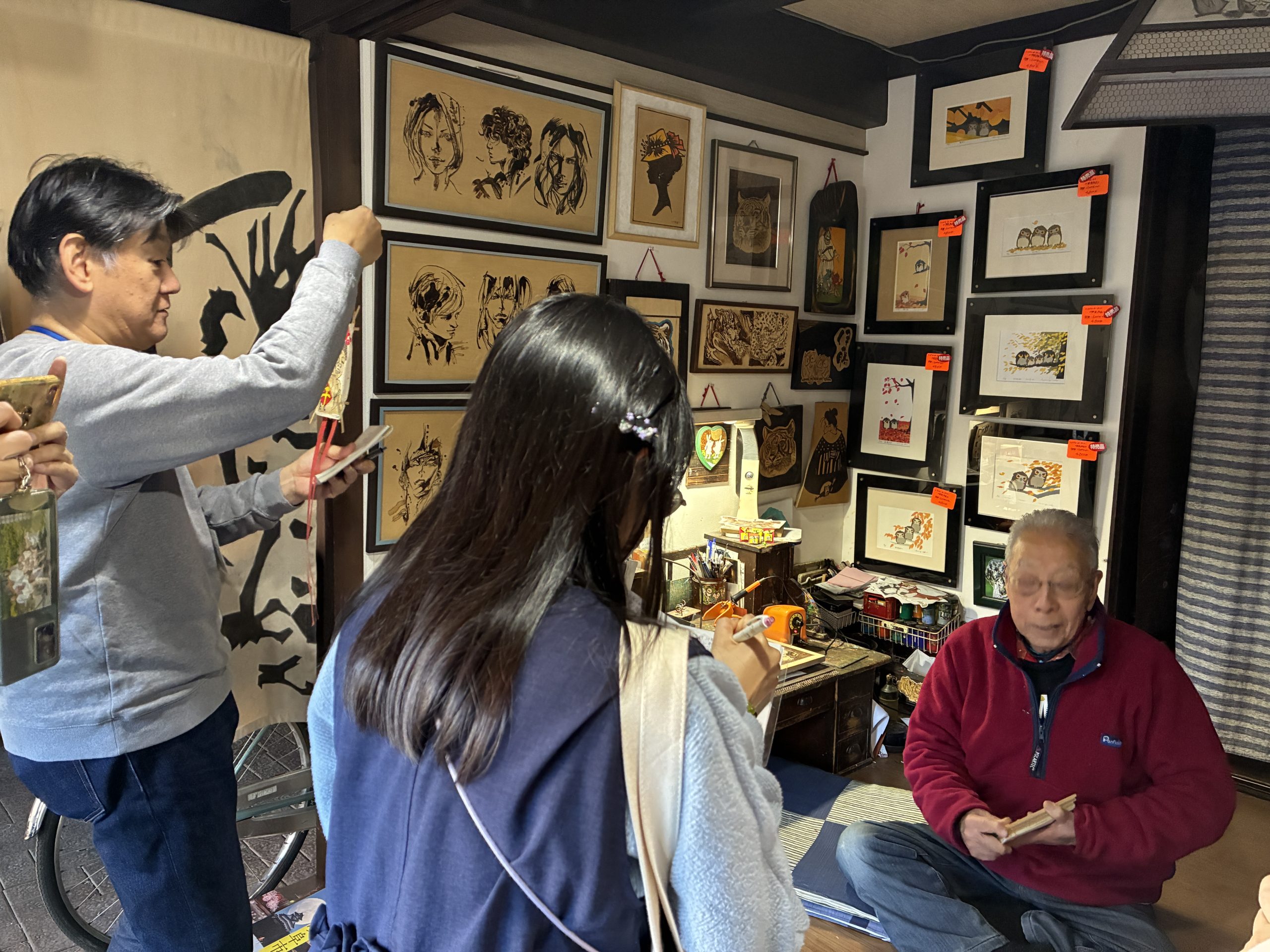 5人ずつのグループに分かれ、店主に質問をする人・写真を撮る人・メモに徹する人と、それぞれ役割を決めて、洋食店「ニューライオン」、イタリア立呑みバール「mano yanagase」、アトリエ「手づくりふくろう絵工房」、ワークショップスペース「PENGUIN BOOTS+」に取材に赴きました。