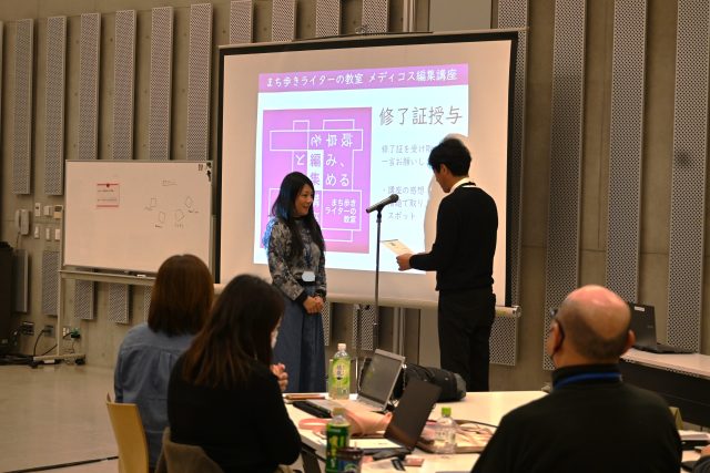 最後に、ぎふメディアコスモス館長から受講生一人ひとりに修了証を渡し、集合写真を撮影して第5期の講座の全行程が終了となりました。