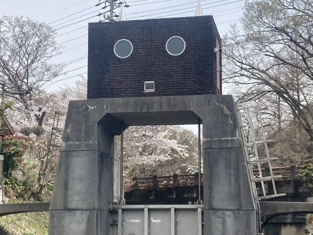 日中友好庭園周辺ではロボット水門越しに見る桜もなかなか良いです。