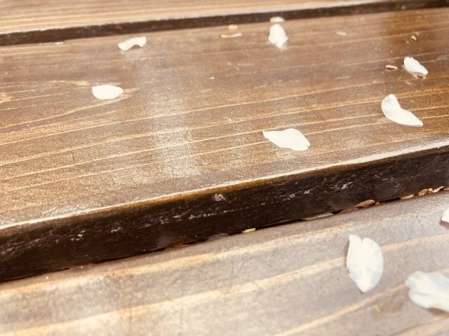 ベンチに落ちた淡墨桜の淡い色の花びらが儚く美しい。