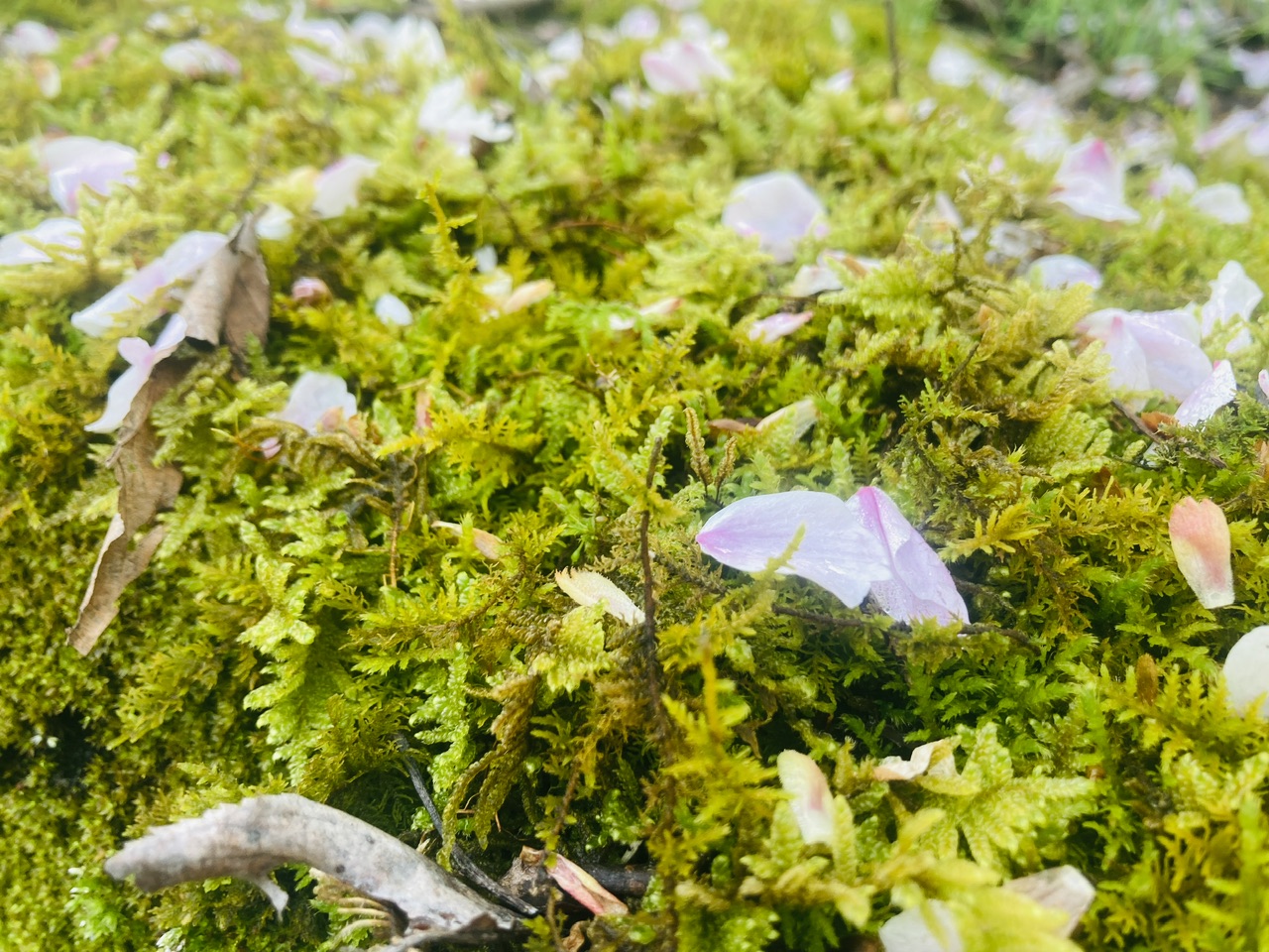 みずみずしい苔の上に可愛らしい桜色の花びら。この季節、何気ない日常の風景の中に桜が溢れている。