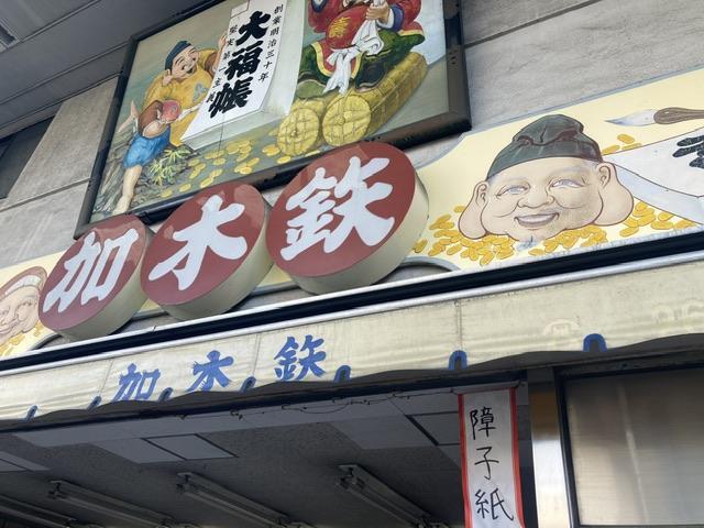 『鉄』の字のつくりが『失』ではなく『矢』になっているのはお金を失わないようにってことなのでしょう。小判に俵に大福帳と見ていると福々しい気持ちになれる看板に手書きの障子紙の文字が温かみを感じるね。柳ケ瀬のバス停を利用するときは、ついつい看板を見上げてしまう神田町の「加木鉃」さん。
