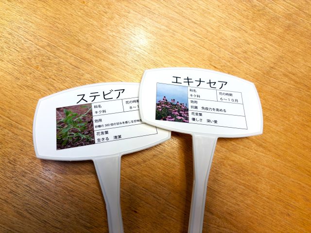 ガーデンラベルは植物名などを記載し、植物の目印にもなります。インターネットで調べると大きさや記載する内容も様々。ハブサポメンバーで意見を出し合い、「やっぱり表示部分が斜めになってる方が見やすいよね」、「花の咲く時期が分かればその時期に見に来てくれるかも」と、どんどんイメージが膨らんでいきました。