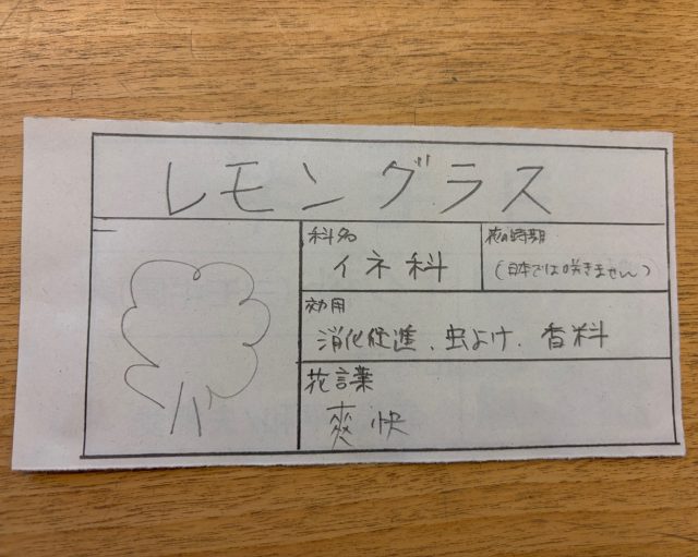 ガーデンを観察して、9種のハーブ(ローズマリー、ボリジ、ミソハギ、エキナセア、レモングラス、フェンネル、レモンバーベナ、ラベンダー、ステビア)のガーデンラベルを作ることになりました。