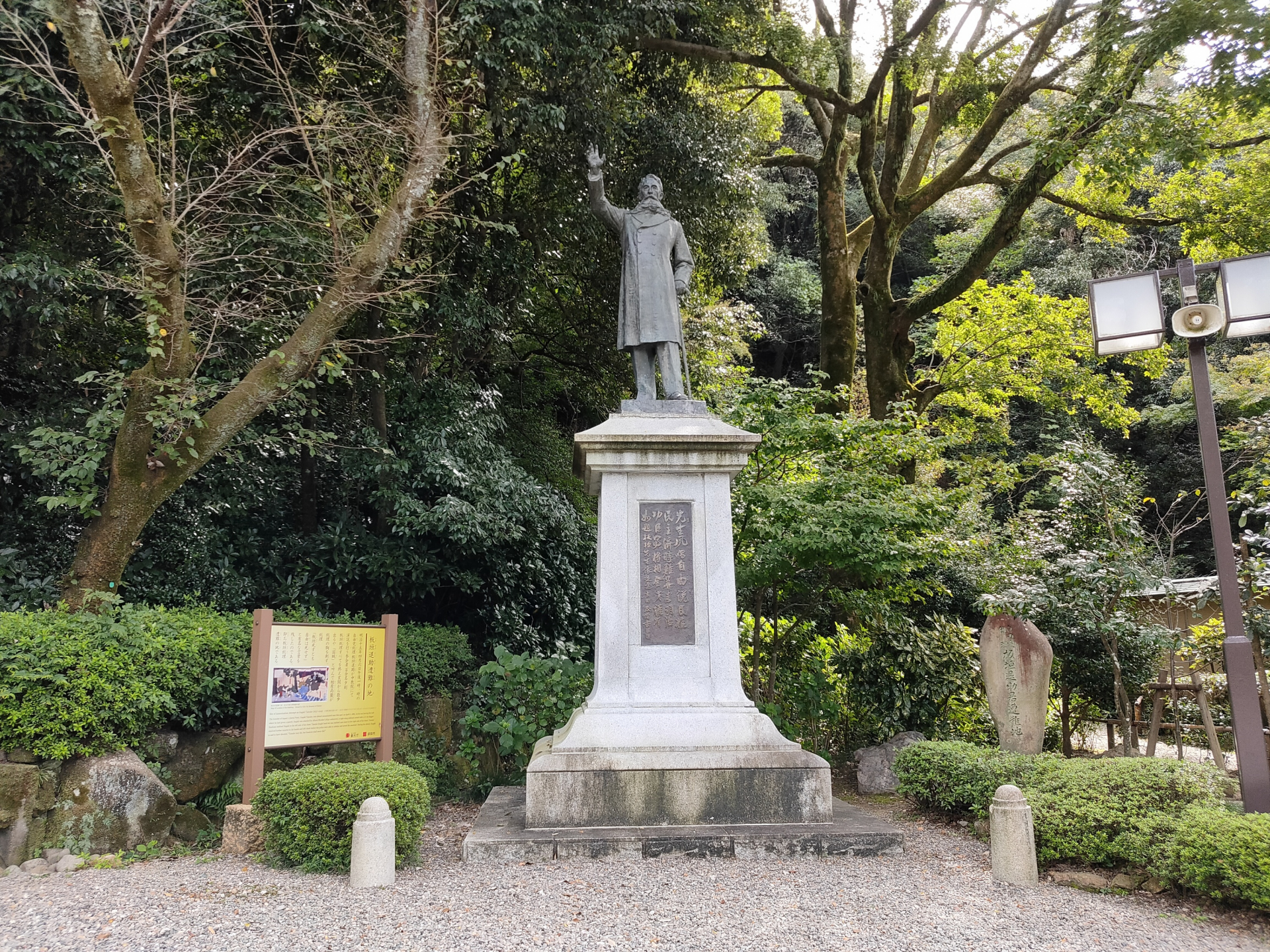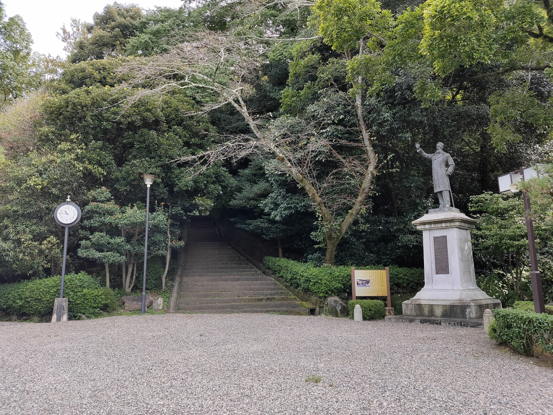 明治15年(1882)4月6日、自由党総理・板垣退助は全国遊説で岐阜に立ち寄り、現在の岐阜公園内で演説した帰り際、暴漢に刺される事件が起きた。命に別状はなかったが、この事件から「板垣死すとも自由は死せず」という有名な言葉が生まれた。その後、有志により大正7年(1918)に銅像が建てられた。なお、第二次世界大戦中の金属回収により一度撤去され、現在の銅像は昭和25年(1950)に再建された2代目。