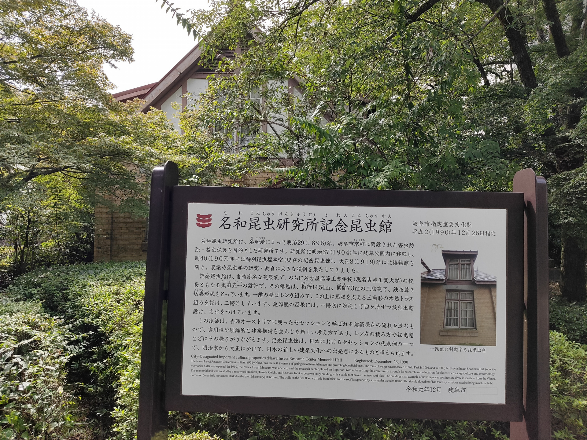 名和昆虫研究所を補完する施設として、名和靖の志を理解する有志の寄附により明治40年(1907)に建設。当時は、特別昆虫標本室と呼ばれ、農業や昆虫学の研究・教育に大きな役割を果たしてきた。設計は隣接する博物館と同じ武田五一氏であり、当時オーストリアに起こったセセッションと呼ばれる建築様式の流れを汲むもので、レンガの積み方や採光窓などにその様子が伺える。平成2年(1991)に岐阜市重要文化財に指定。