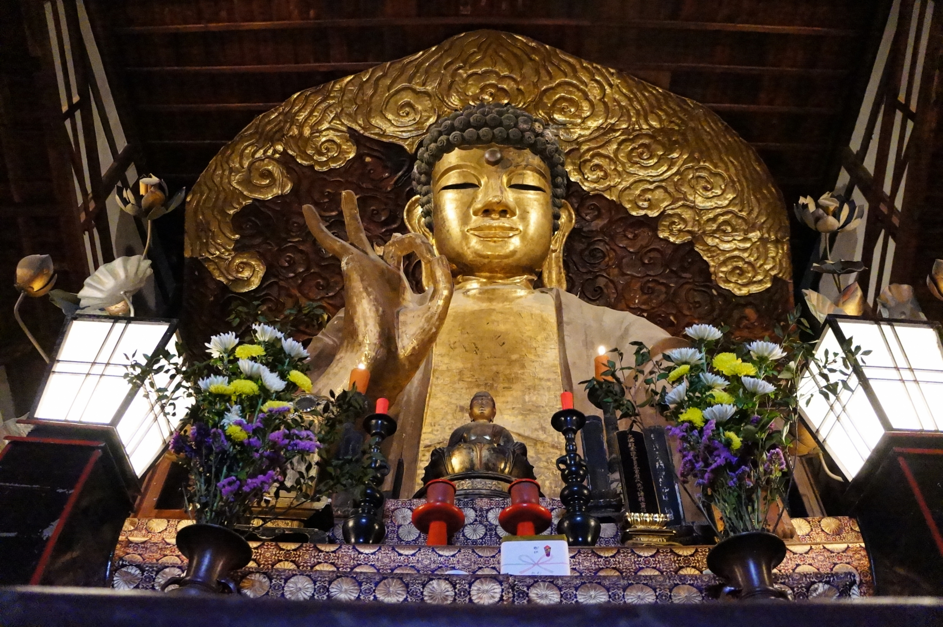 寛政6(1794)年から38年の歳月をかけ、二代の和尚の苦業の末に建立された「岐阜大仏」。大イチョウの木を真柱とし、編んだ竹材と粘土で型を作り、経文が書かれた紙を貼って、その上に漆と金箔を施している。高さは13.7mと乾漆仏としては日本一の大きさを誇る。荘厳な雰囲気の大仏殿に鎮座し、微笑みかけるように穏やかな表情を浮かべる大釈迦如来坐像。その姿は訪れる参拝者の心を癒してくれる。