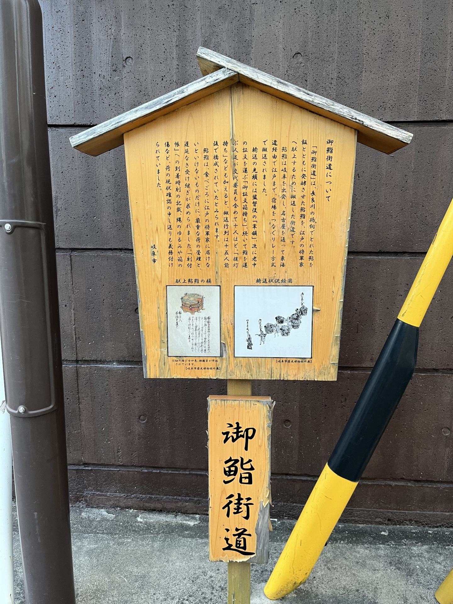 江戸時代、長良川の鵜飼で捕れた鮎は、御鮨所と呼ばれる施設で飯と一緒に発酵させて鮎鮨とされ、尾張藩からの献上品として江戸の将軍家に運ばれた。岐阜から笠松町を経て名古屋、熱田へと続く岐阜街道(尾張街道)はそのルートとなったことから、御鮨街道(別名・鮎鮨街道)と称される。江戸までは昼夜兼行で運ばれ、4、5日で到着したという。街道沿いには今も、かつての岐阜の風情を感じさせる景観が多く残されている。