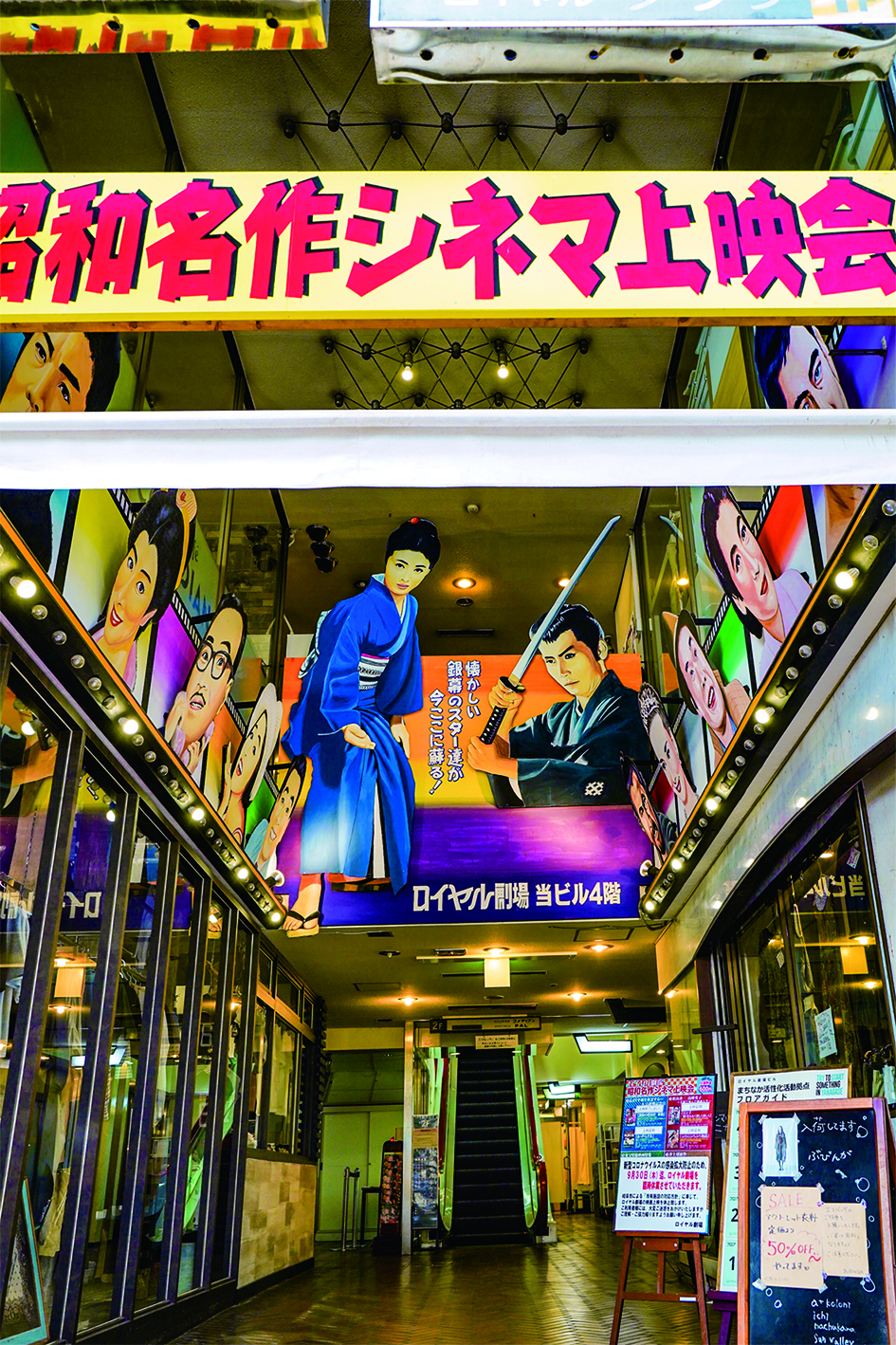映画館がひしめき合い賑わっていた柳ケ瀬で、1978年開館した『ロイヤル劇場』。懐かしい国内の昭和名作映画を、映写機を毎日メンテナンスし、現代では珍しい35mmフィルムでの上映を続けてきた。往年のスター俳優らの手描き看板をくぐり、エレベーターで4階に降り立つと、往時と変わらぬ愛しき名画座が現れる。
