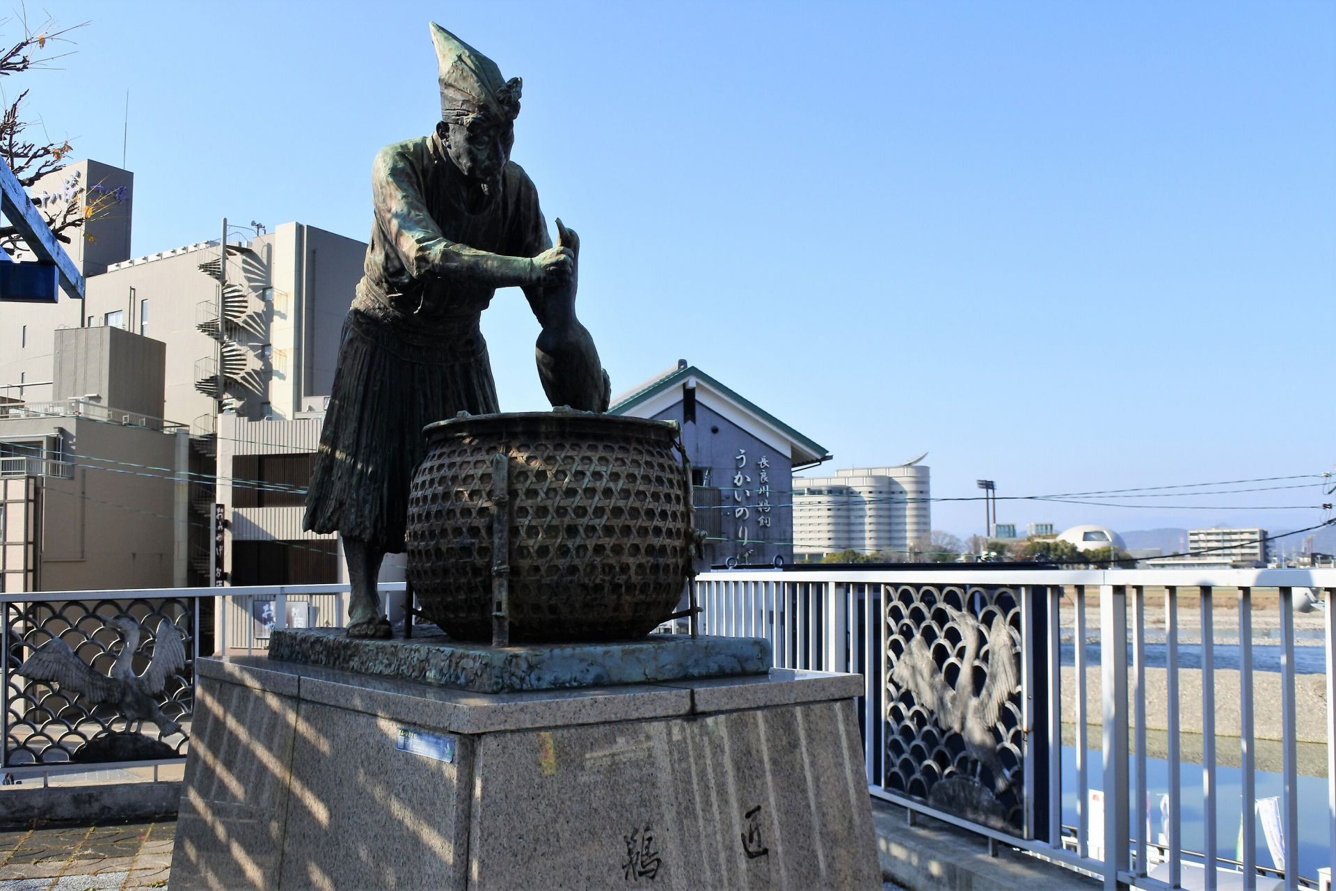 長良川と暮らす 鵜匠の像(ポケットパーク鵜かがり) 鵜匠の像(鵜匠像のモニュメント)は、昭和56(1981)年、岐阜市初のポケットパーク「鵜かがり」内にある。俳人・河東碧梧桐(かわひがしへきごとう)の鵜飼にゆかりのある句碑もある眺めのよい公園で、観光客の休憩やくつろぎの場として、また、市民のふれあいの場として利用されている。 基本情報Spot Information スポット名 鵜匠の像(ポケットパーク鵜かがり) スポット名よみ うしょうのぞう(ぽけっとぱーくうかがり) 住所 岐阜市湊町 エリア 川原町界隈 テーマ 長良川と暮らす 一覧へ戻る